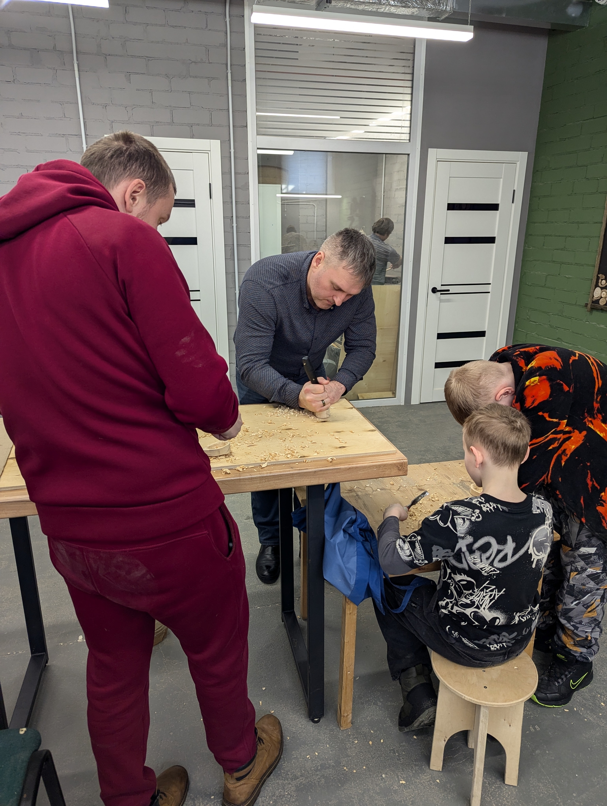 Под чутким руководством нашего наставника все освоили работу с инструментом: кто‑то впервые взял в руки резец, кто‑то уже немного умел, но все учились друг у друга.